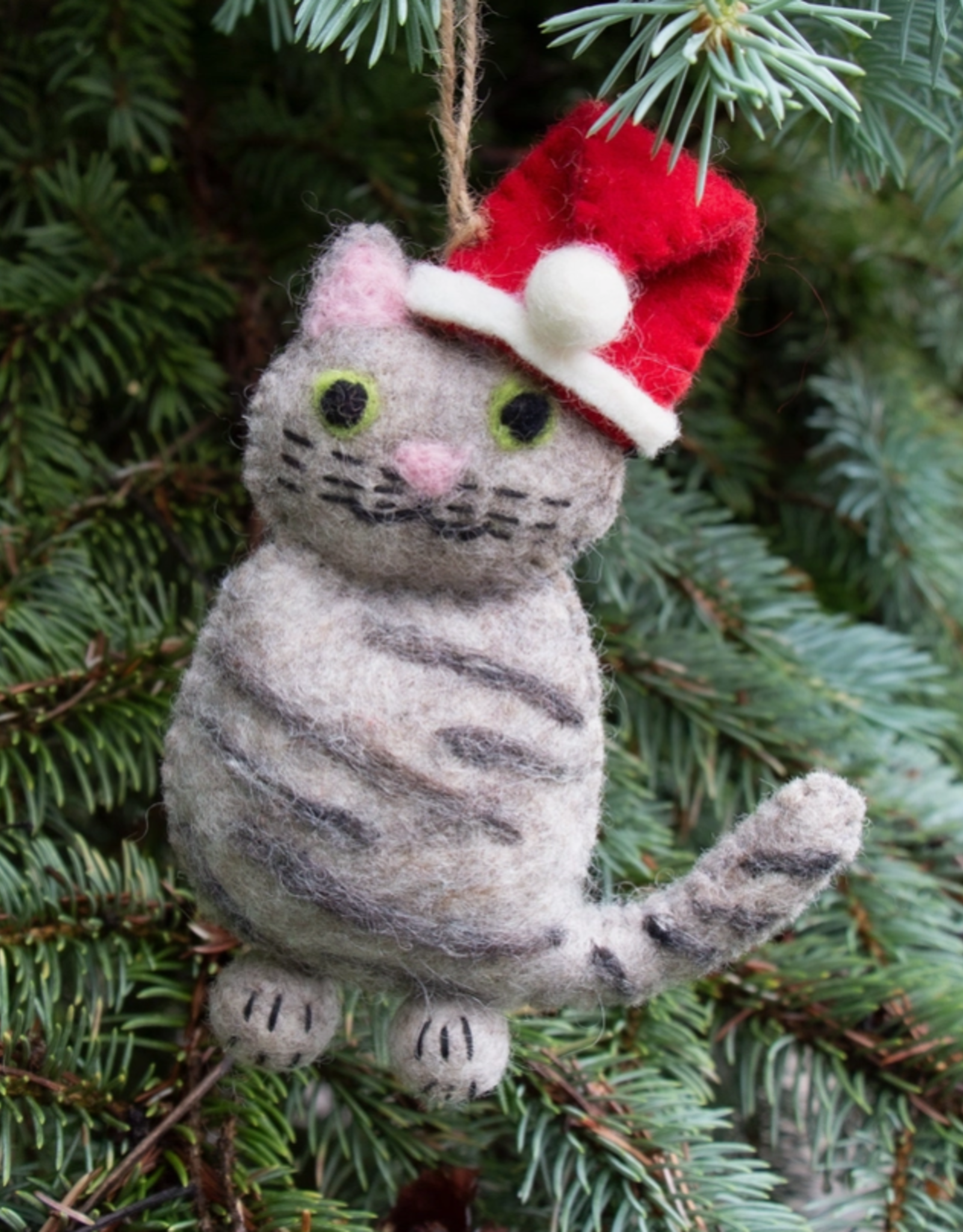 The purrfect eco-friendly, wool ornament for the cat lover! This cute ornament is intricately detailed and lovingly crafted by mother and sister artisans in Nepal. Eco-friendly wool felt.
