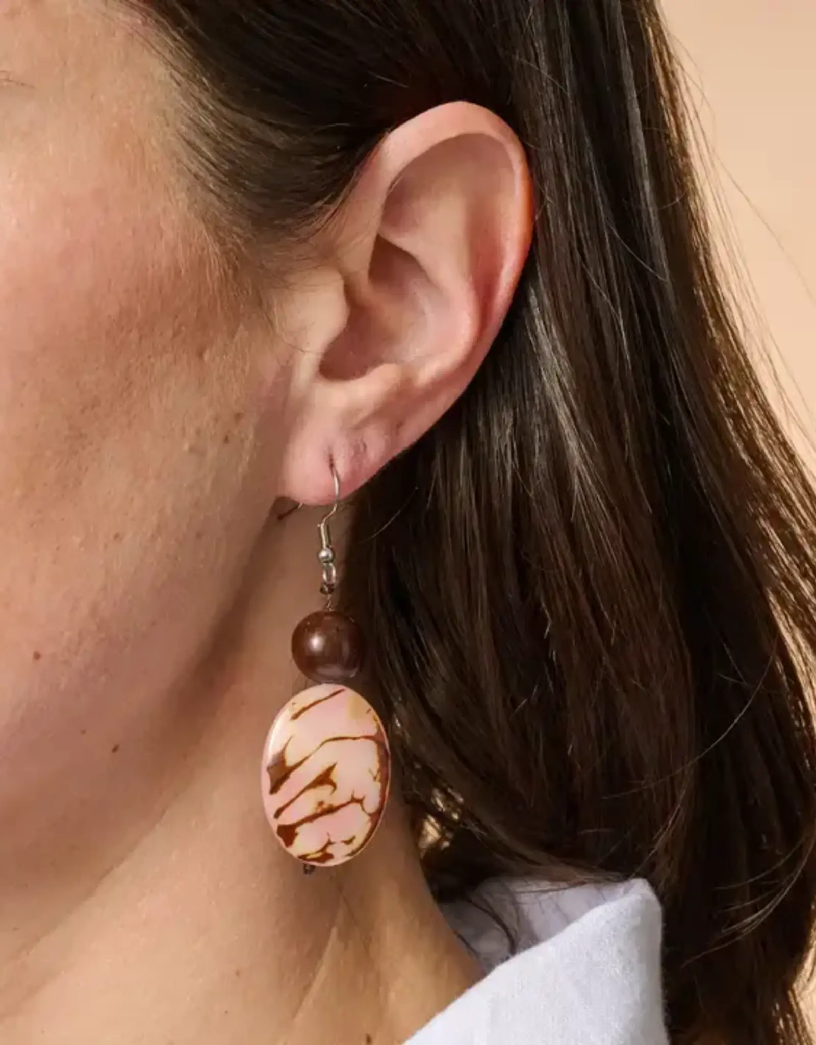 Add a drop of natural beauty to any outfit with the Tagua & Coconut Drop Earrings. Featuring a refined drop design, these handcrafted earrings combine light pink tagua beads and rich brown coconut beads, creating a striking contrast. Hung on silver metal French hooks, they offer a stylish touch for both casual and dressy occasions.