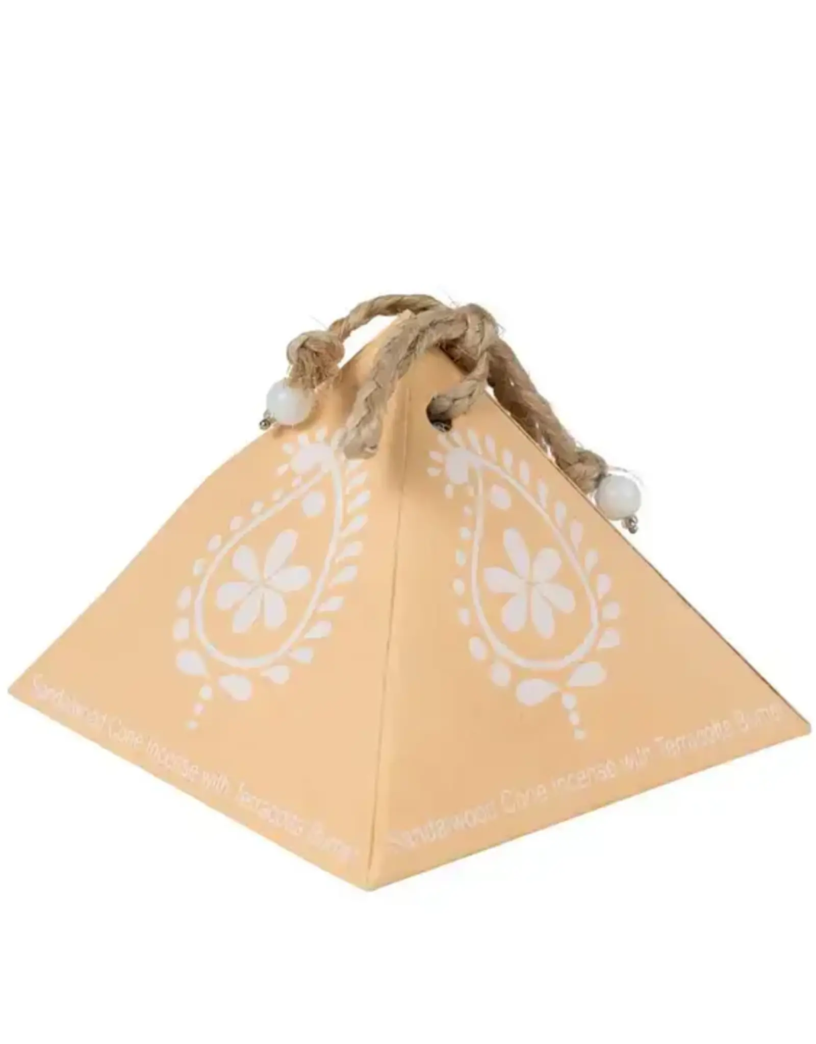Enjoy the calming sensations from the sweet scent and aromatherapy of the Sandalwood Cone Incense Set made by artisans working with Silence in India. Set contains 10 sandalwood incense cones and a handcrafted terracotta incense burning plate, all in a mesh drawstring bag inside a paper pyramid box.