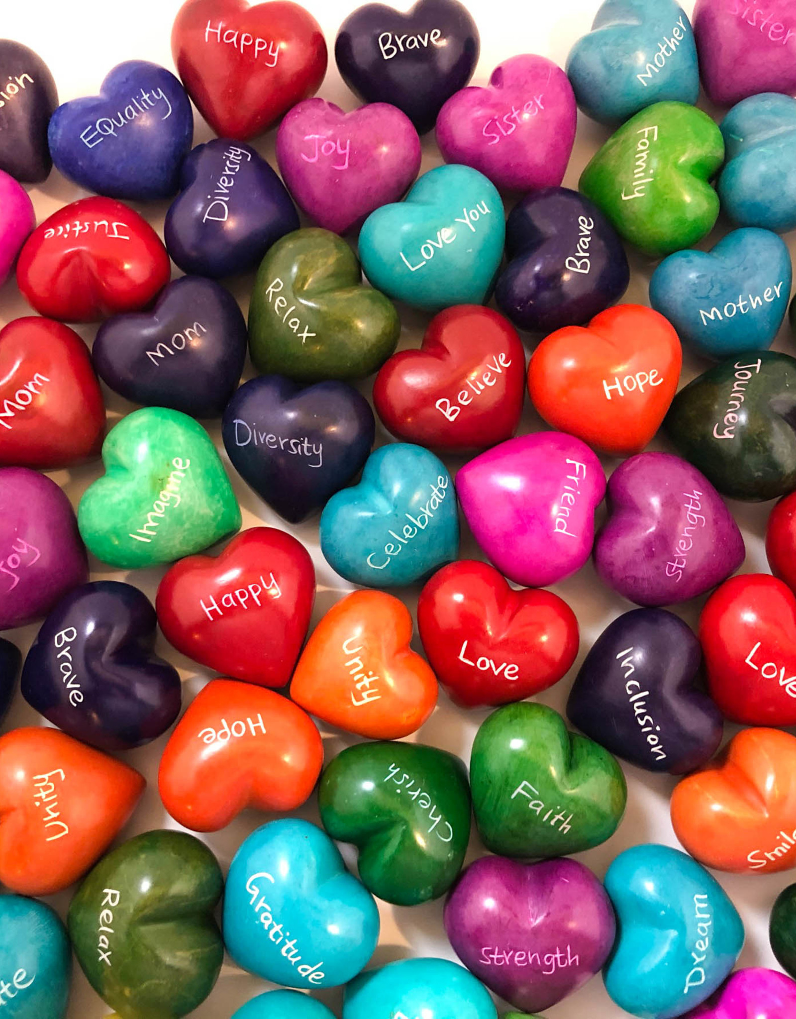 These colorful hearts are a fair trade product handmade in Kenya. They are hand carved out of stone, sanded, dyed, and then etched, all using simple hand tools.